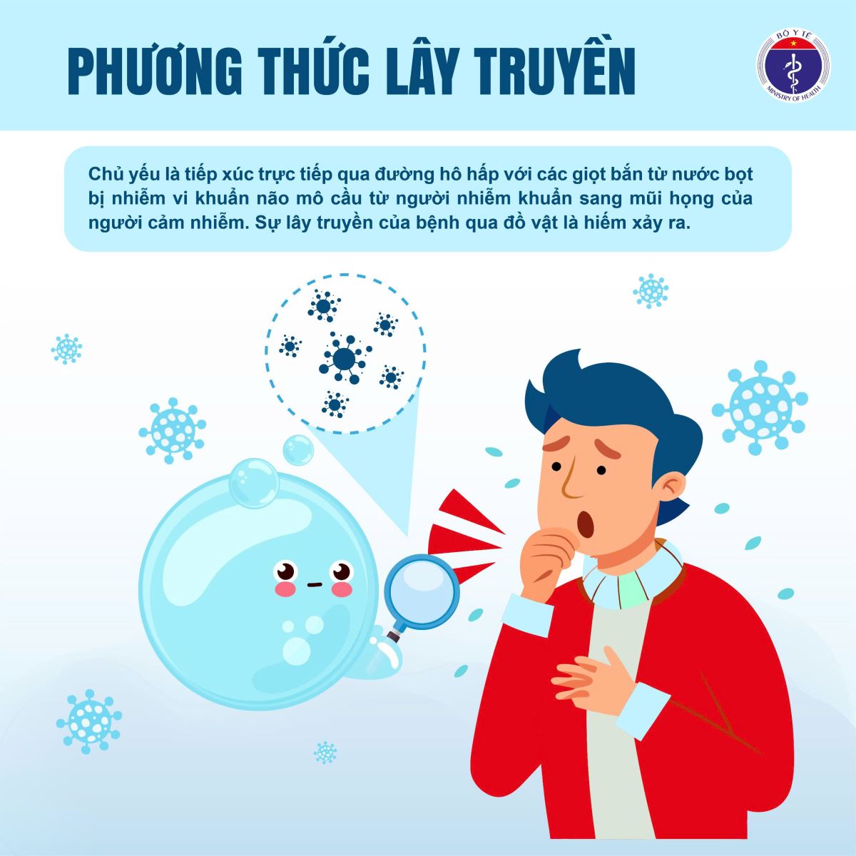 - Thời kỳ lây truyền: Tuỳ thuộc vào sự tồn tại của vi khuẩn não mô cầu ở mũi họng của người nhiễm khuẩn và vi khuẩn sẽ biến mất ở mũi họng sau 24 giờ điều trị kháng sinh.