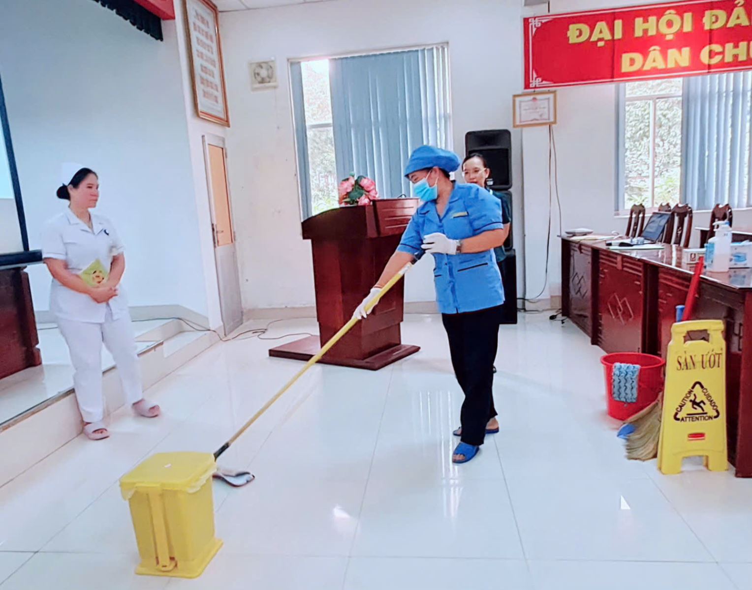 Chị Đặng Thị Thúy hộ lý (áo xanh đội nón) đang xử lý tình huống
