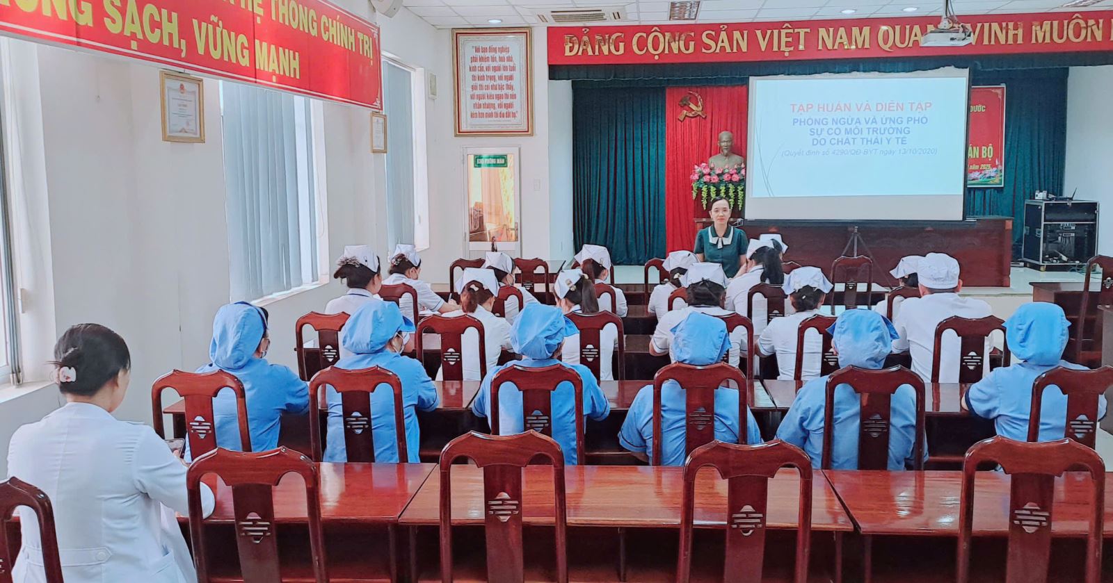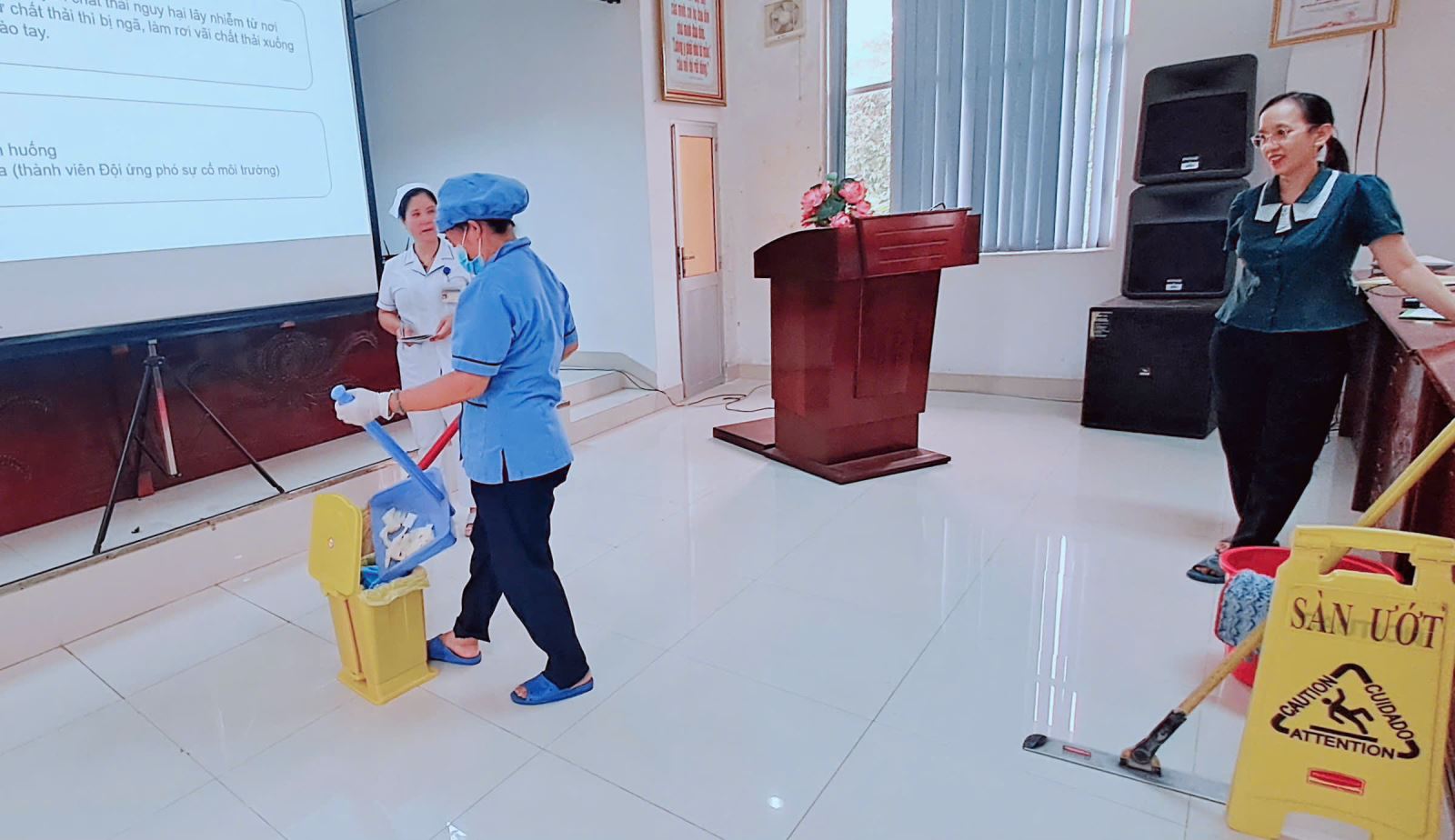 Báo cáo viên của lớp tập huấn là Bà Võ Thị Thanh Lan, Tổ trưởng Tổ kiểm soát nhiễm khuẩn, Đội trưởng Đội ứng phó sự cố môi trường TTYT tế khu vực Cần Đước đã truyền tải đến học viên những nội dung chính của kế hoạch phòng ngừa và ứng phó sự cố môi trường do chất thải y tế và quy trình xử lý các sự cố xảy ra trong phạm vi TTYT và trong khả năng ứng phó của TTYT. Các thành viên Đội phòng ngừa và ứng phó sự cố môi trường do chất thải y tế đã hướng dẫn kỹ năng xử lý tình huống giả định có thể xảy ra tại TTYT như: Sự cố rơi vãi chất thải lây nhiễm là mẫu bệnh phẩm (dịch tiết, máu …) từ nơi phát sinh đến khu lưu giữ chất thải.